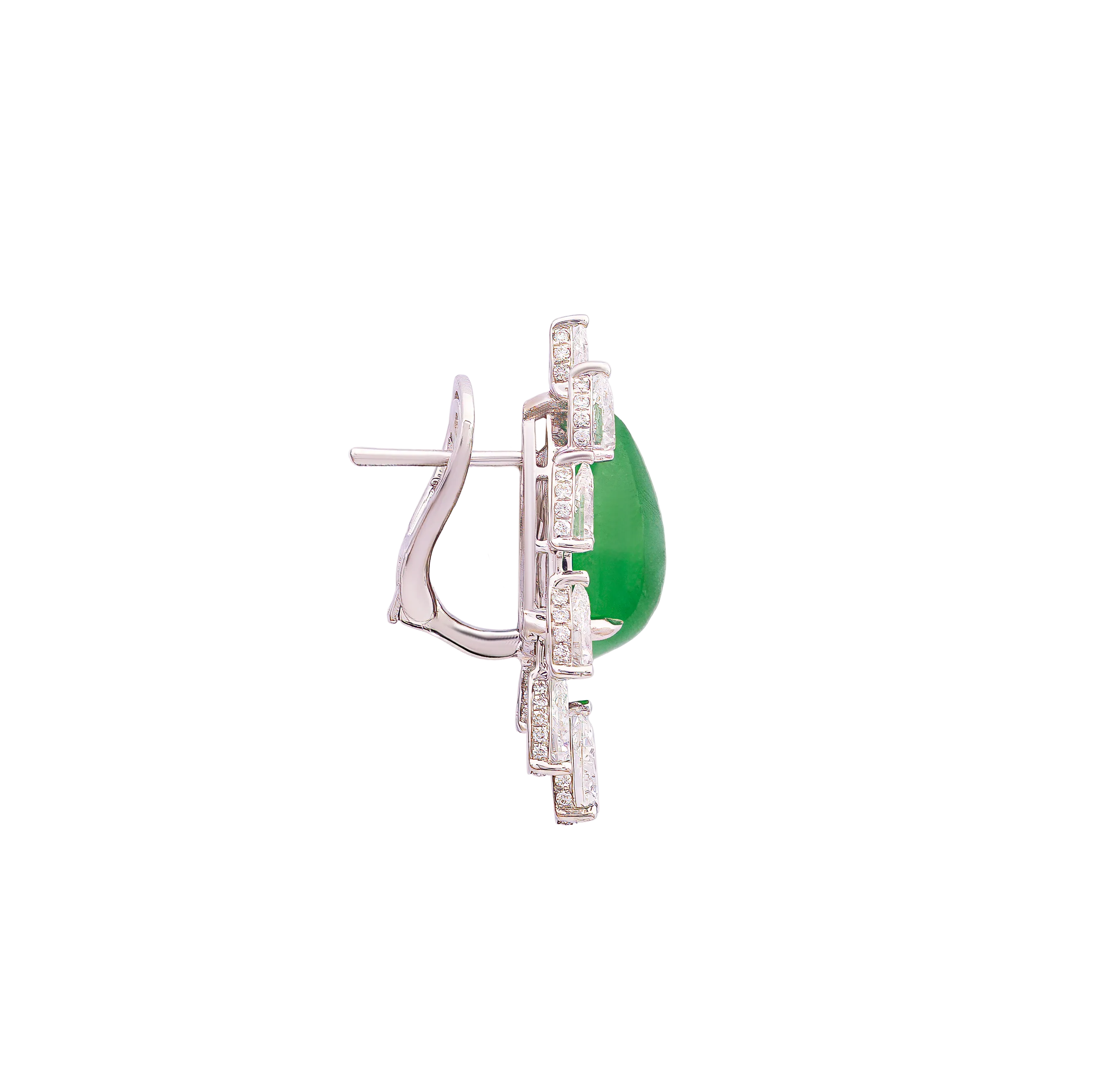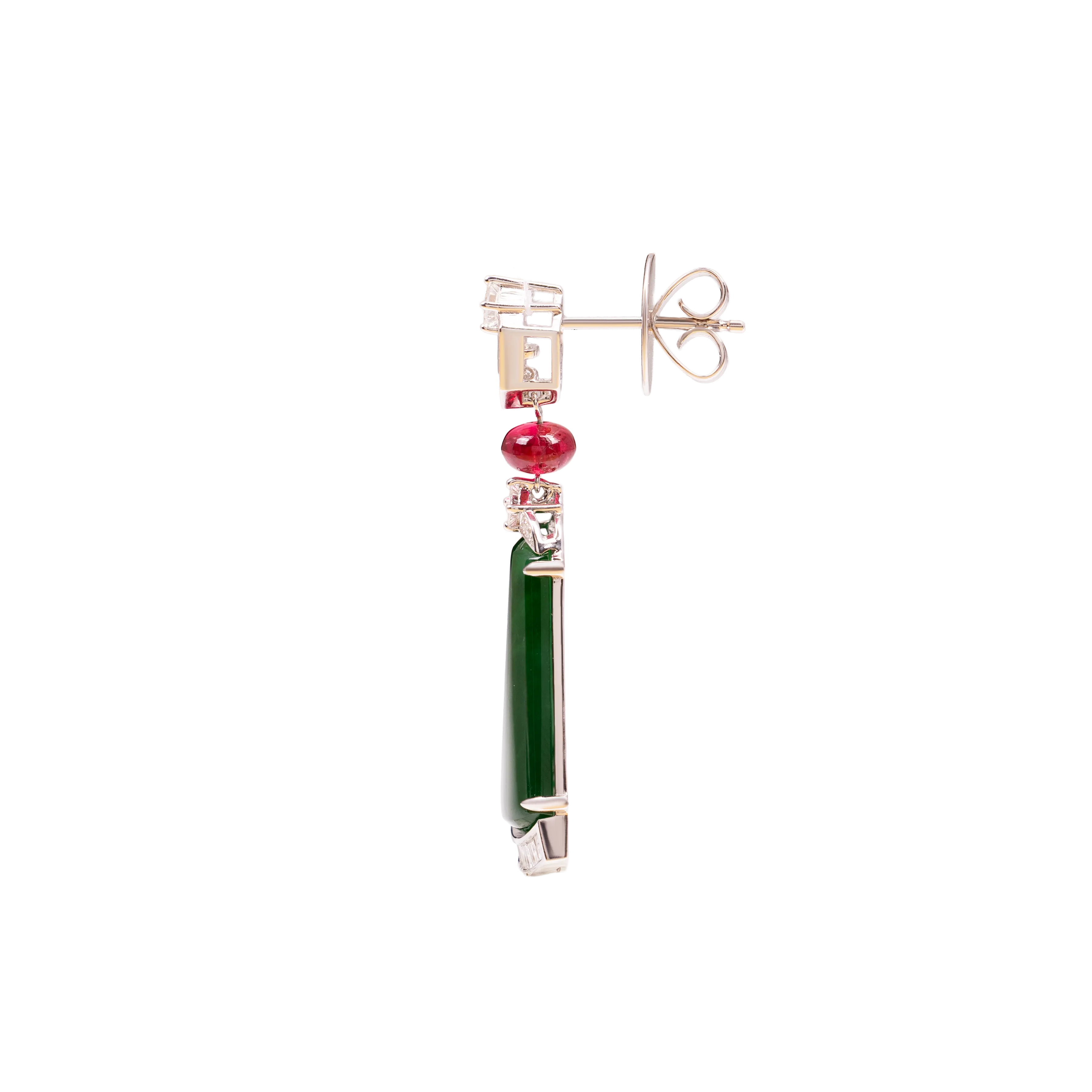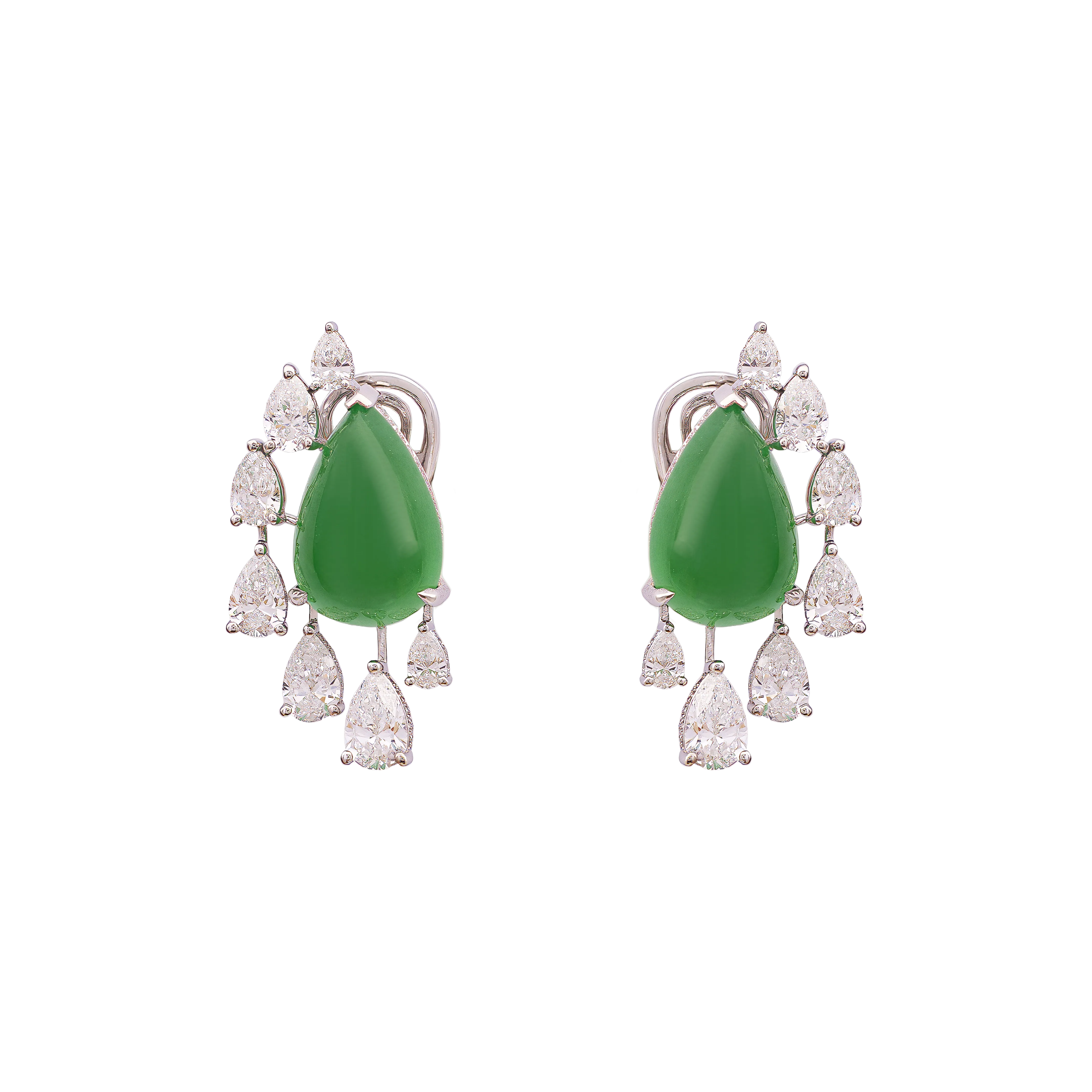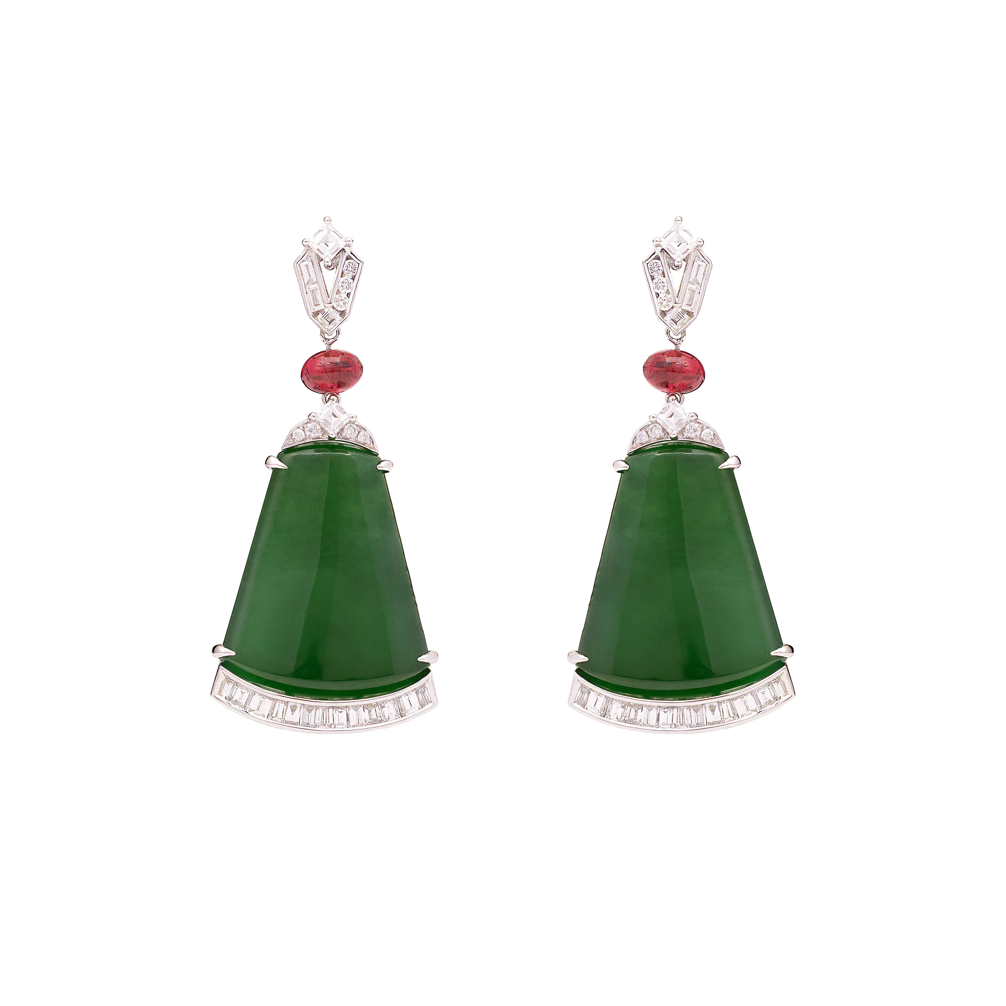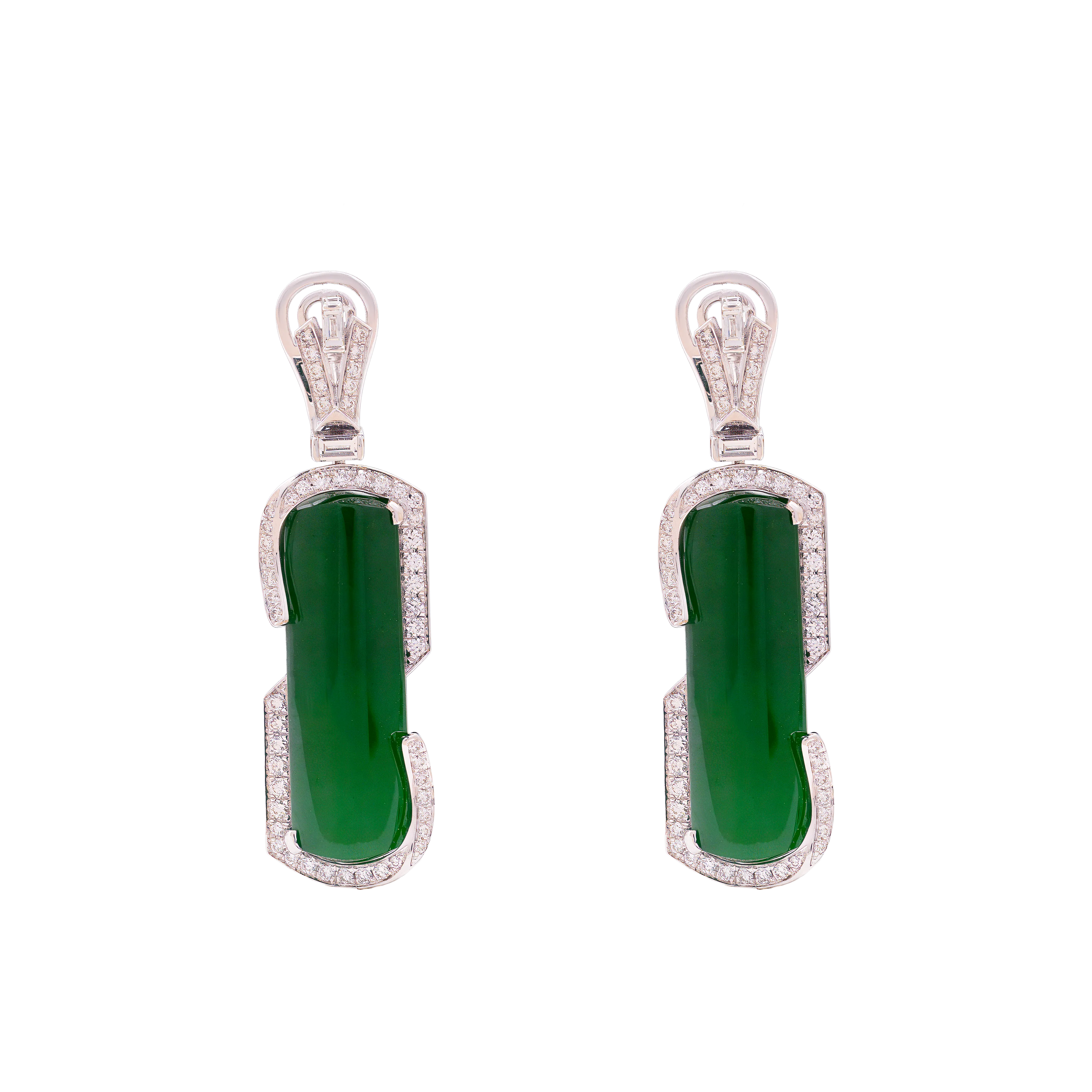 In traditional jade forms, the half-moon reflects balance, progression, and measured beauty. These earrings feature half-moon jadeite framed by an angular arrangement of mixed-cut diamonds, creating clean lines and structured contrast. Refined and sharp in character, the design is suited for both formal and everyday occasions, offering a flattering frame that draws light to the face.