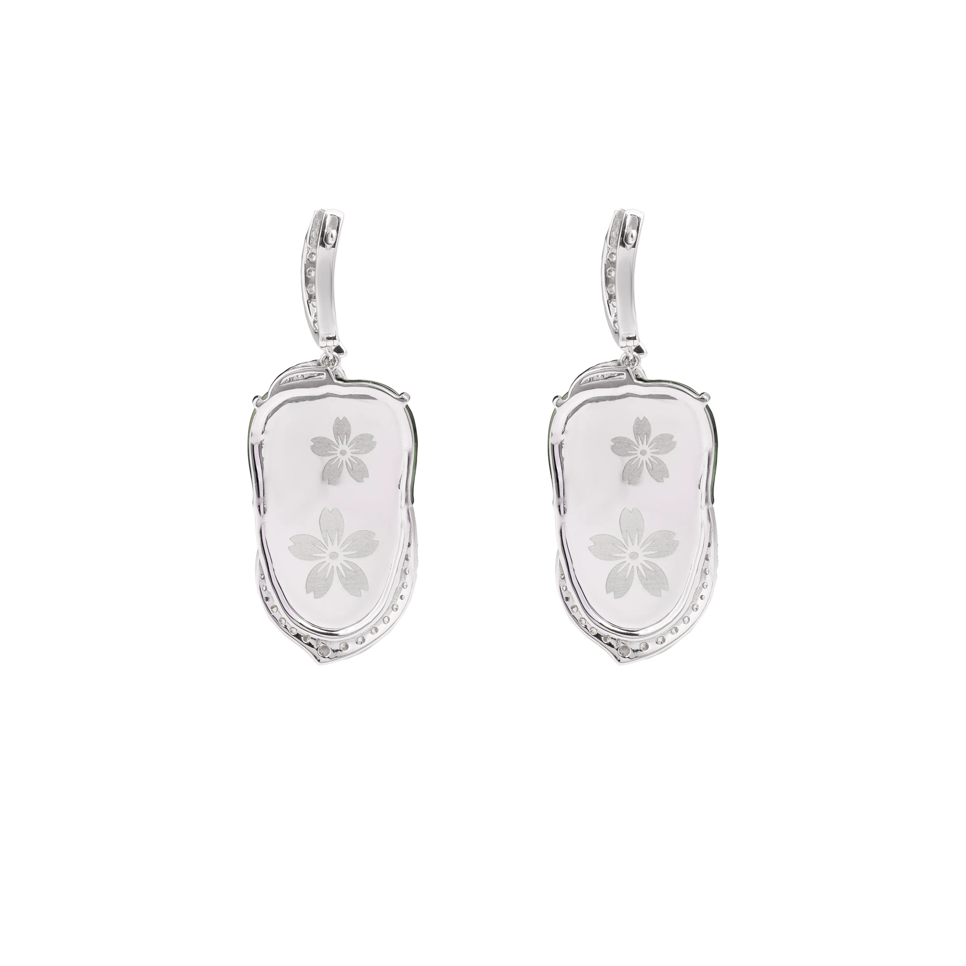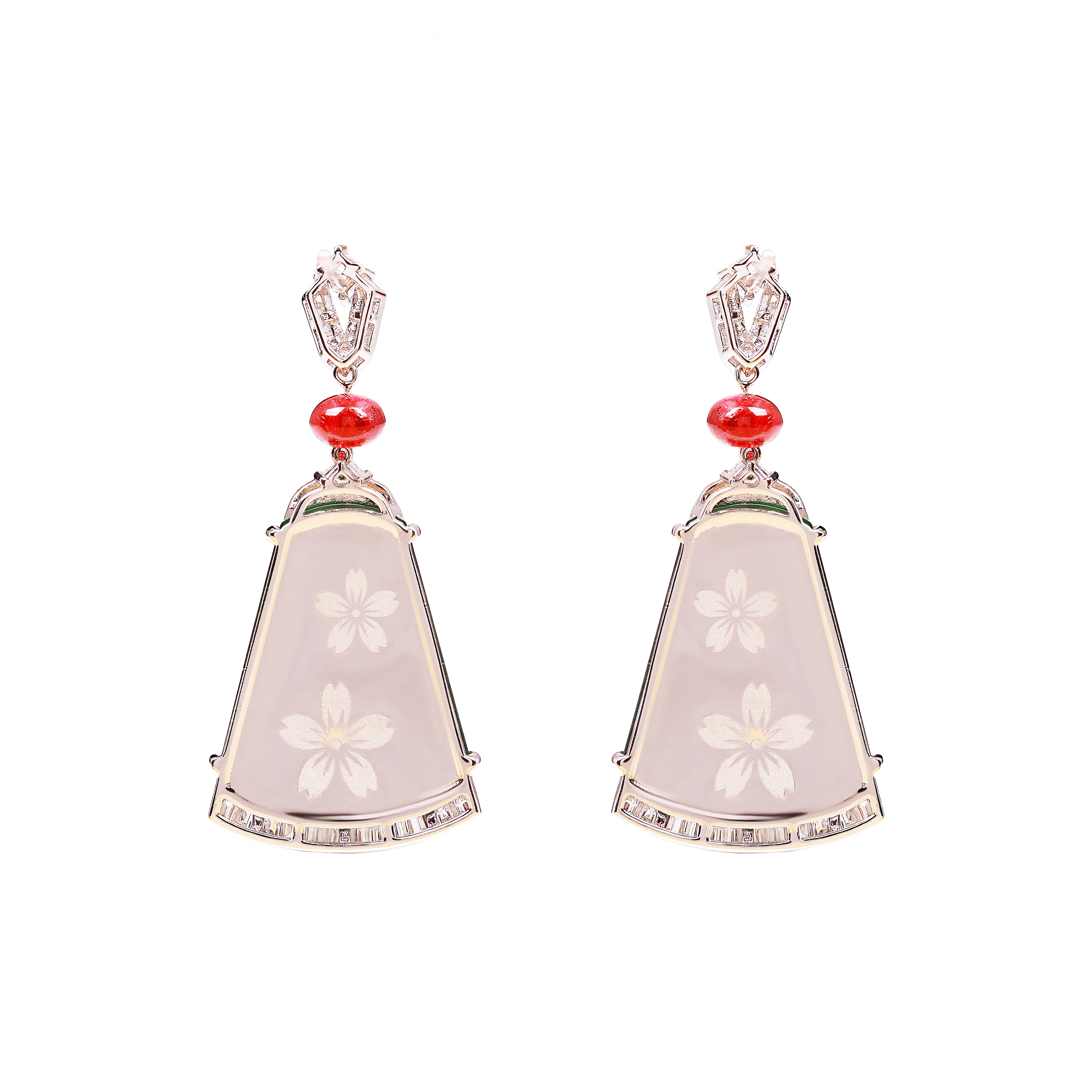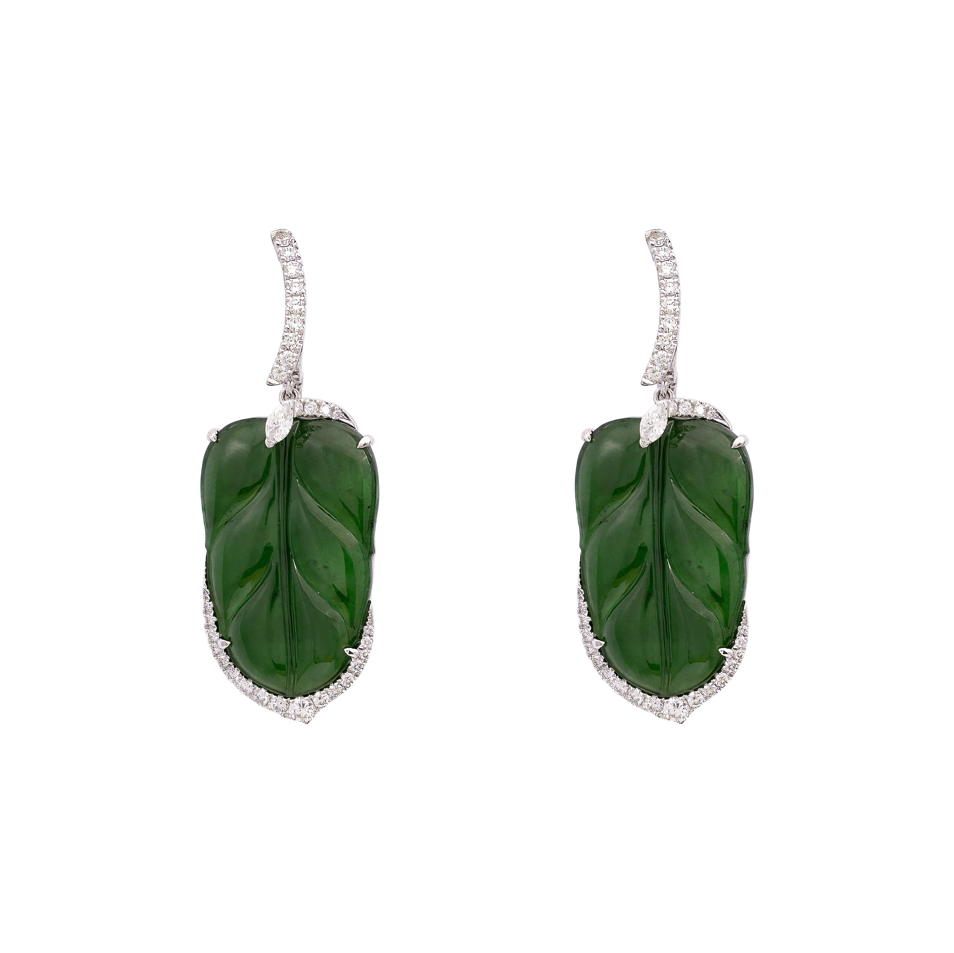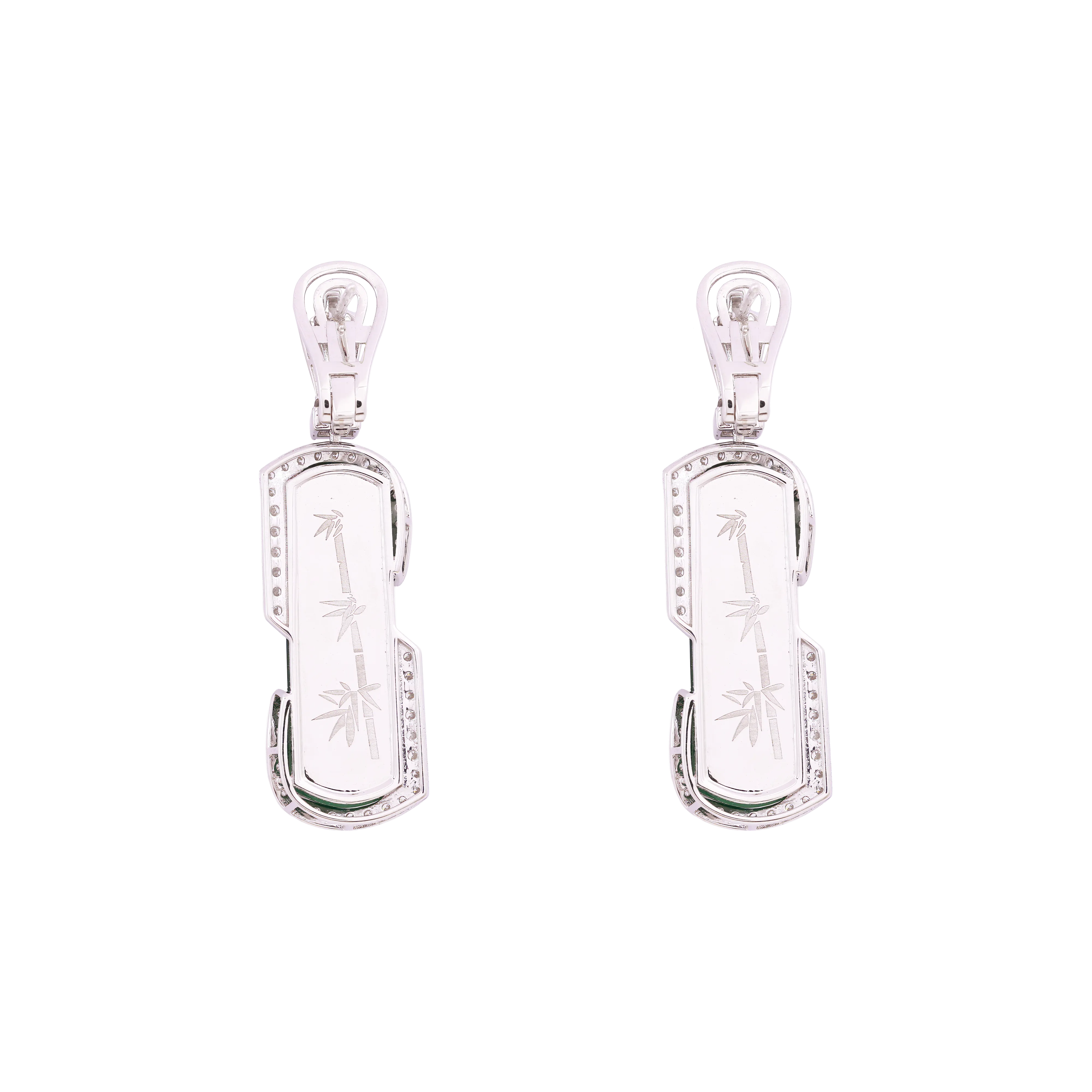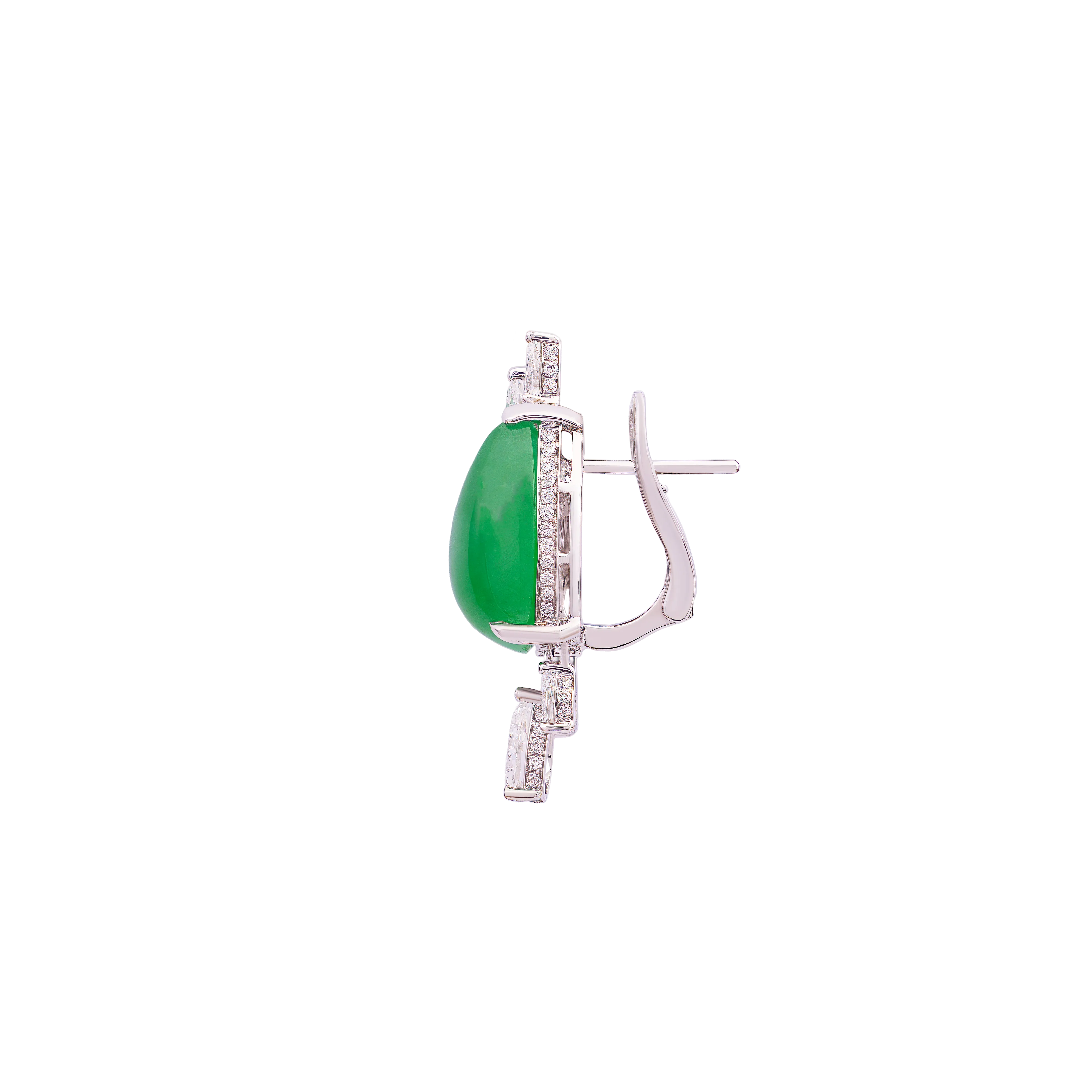 In traditional jade forms, the half-moon reflects balance, progression, and measured beauty. These earrings feature half-moon jadeite framed by an angular arrangement of mixed-cut diamonds, creating clean lines and structured contrast. Refined and sharp in character, the design is suited for both formal and everyday occasions, offering a flattering frame that draws light to the face.